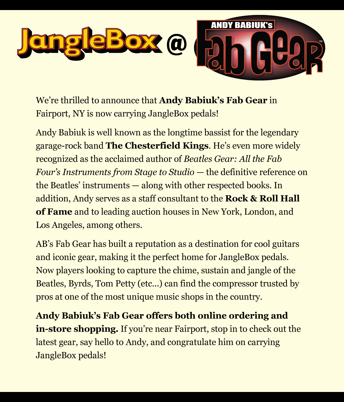 Looking for a great selection of Rickenbackers, Fenders, Gretsches and JangleBox pedals? Here you go: www.andybabiuksfabgear.com